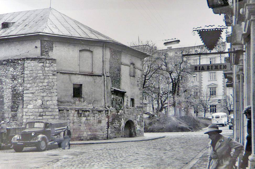2. Заметка о пивбаре "Під вежею", который работал в 1969-1990-х гг. в том помещении, где сохранилась полубашня. Фото 1971 р. Ліворуч будівля Старого арсеналу, праворуч - фасад будинку з вивіскою пивбару "Під вежею":