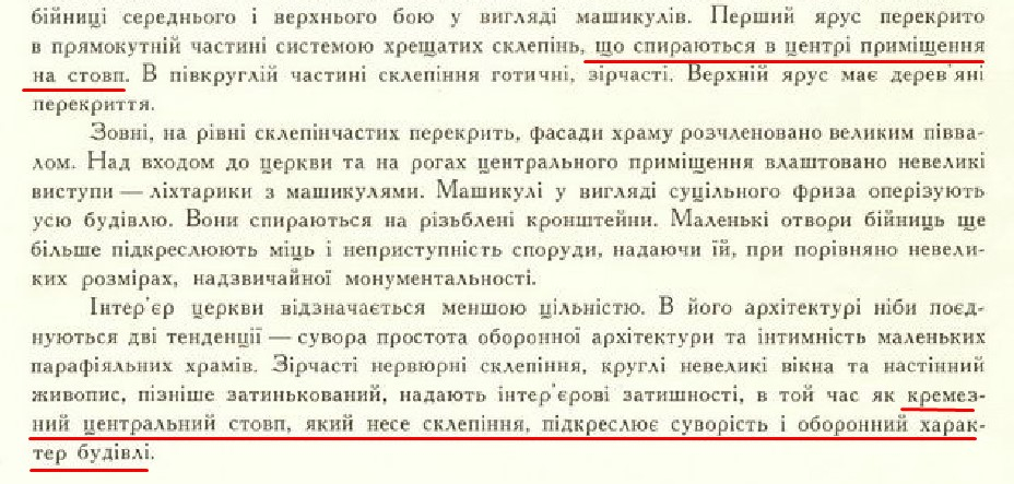 Колонна в центре церкви - доказательство существования таинственного донжона или не такая уж и уникальная для храма деталь? К опоре, расположенной прямо по центру церкви, важно отдельно присмотреться как минимум по следующим причинам: Эта опора в любом случае представляет собой проблему. Если её не анализировать, то она выглядит малопонятной деталью без каких-то конкретных аналогов (как мы знаем, в Украине нет храмов с колоннами прям в центре). Если же её анализировать, то это открывает много новых направлений для объяснений, как и почему эта опора оказалась в центре храма. Чем более редкой выглядит деталь, тем проще при помощи аналогов понять историю архитектуры памятника, чтобы, например, разобраться, где находятся корни того планировочного решения, которое было использовано в Сутковцах. В исследованиях Евгении и Ольги Пламеницких эта опора занимала настолько важное место, что она была одной из нескольких основных деталей, которые оказали влияние на гипотезу упомянутых авторов, согласно которой большую часть своей истории памятник в Сутковцах выполнял роль не храма, а чисто-оборонной постройки, ведь, по мнению всё тех же авторов, столб в центре был несовместим с храмовой функцией: "история архитектуры не дает ни одного примера, где единственный в интерьере столб располагался бы в центре храма перед алтарем" [35]. Важно также и то, что колонна (а это именно колонна, не просто "столб", как эту опору практически все исследователи называли) несёт в себе черты стиля (точнее - смешение стилей), что также важно для анализа стиля архитектуры храма в целом, а также для датировки и поиска того, чем мог вдохновляться архитектор. Впрочем, стиль церкви это достаточно обширная и спорная тема, так что её мы обсудим отдельно. Помимо всего этого мне было просто интересно выполнить срез, чтобы посмотреть, как в разное время разные авторы работали с этой действительно интересной деталью - кто упоминал, а кто нет, кто выделял, а кто лишь бегло и без явного интереса по верхам проходился, кто анализировал, и к каким выводам приходил. Источник Кто что писал об этой колонне? Юзеф Ролле в своей статье о Ярмолинецких-Сутковецких [1] кратко сообщил, что церковь "сводчатая", и что своды эти опираются на "мощный столб". Впрочем, возможно, что скорее не странно-расположенная по центру храма опора интересует автора, а расположенное близ неё захоронение Александра Балабана (об этом подробнее в отдельной теме). В 1890 г. в "Географическом словаре" [2] автор справки упомянул, что своды опираются на расположенном посредине "одном столбе": В публикации 1889 г. [3] Е. Сецинский (который, как мы знаем, первым детально описал храм) упоминает "громадный столб", который служит опорой для сводов нефа. Здесь также отмечена другая особенность, которая позднее будет интриговать исследователей - вход, колонна и алтарь находились на одной оси, так что при входе взор первым делом упирался в столб, за которым уже располагалась алтарная апсида. Это же описание автор повторяет в другой своей работе - в "Приходах и церквях Подольской епархии" (1901) [4] Е. Сецинский, публикация 1912 г. [6] Е. Сецинский, публикация 1928 г. [9] Формулировки и другие наработки Е. Сецинского в своей справке о церкви 1905 г. использовал Григорий Павлуцкий, в публикации которого [5] также встречаем первый план и сечение церкви, где был показ